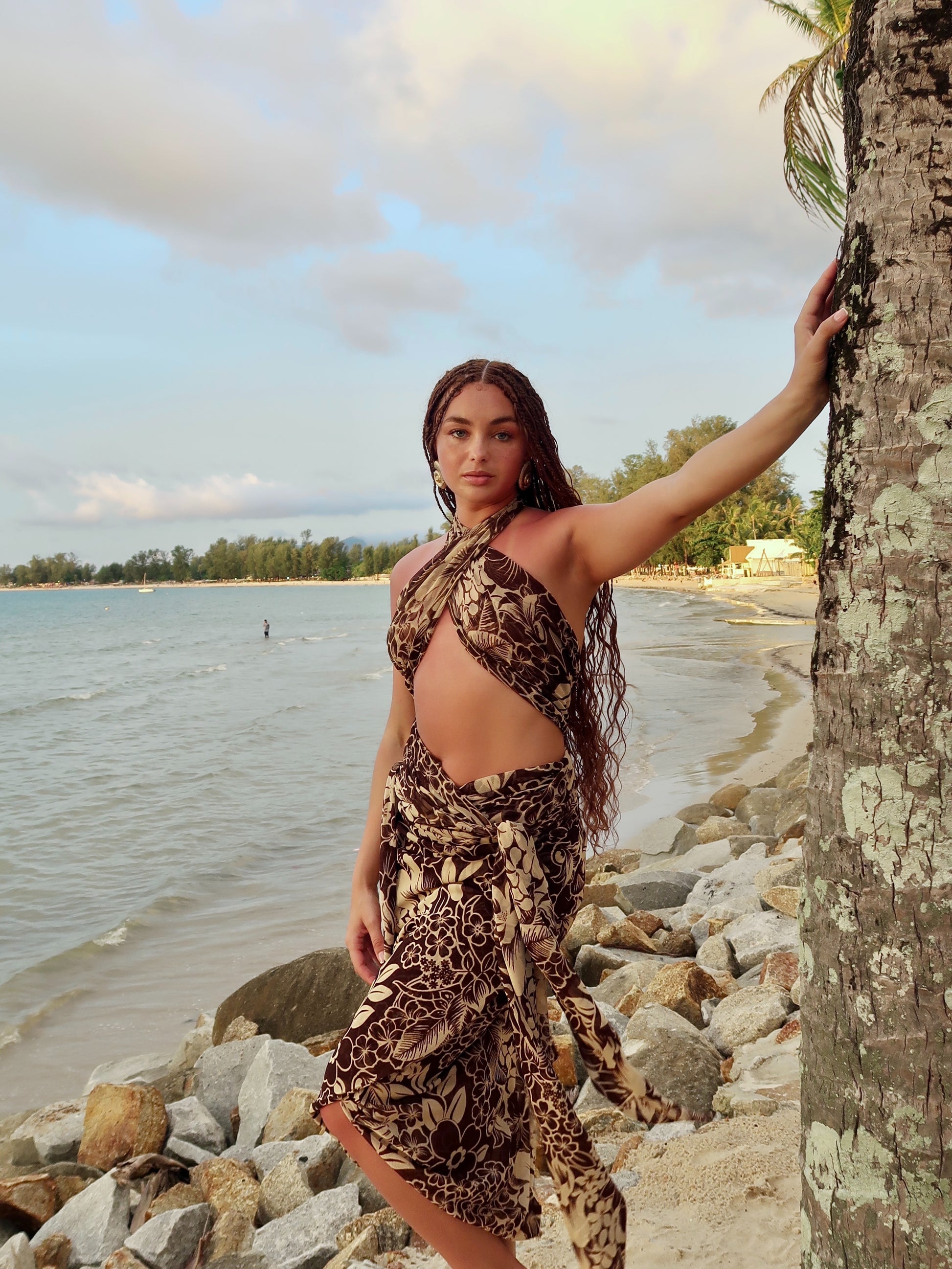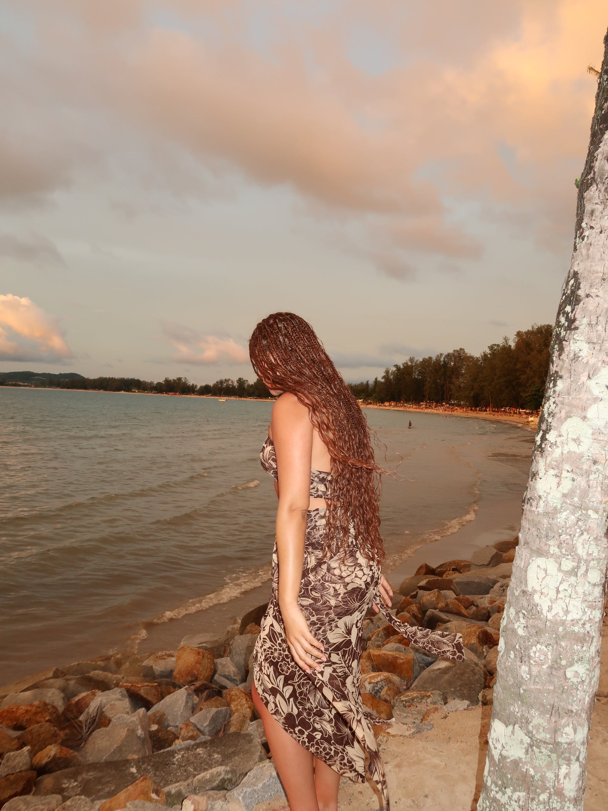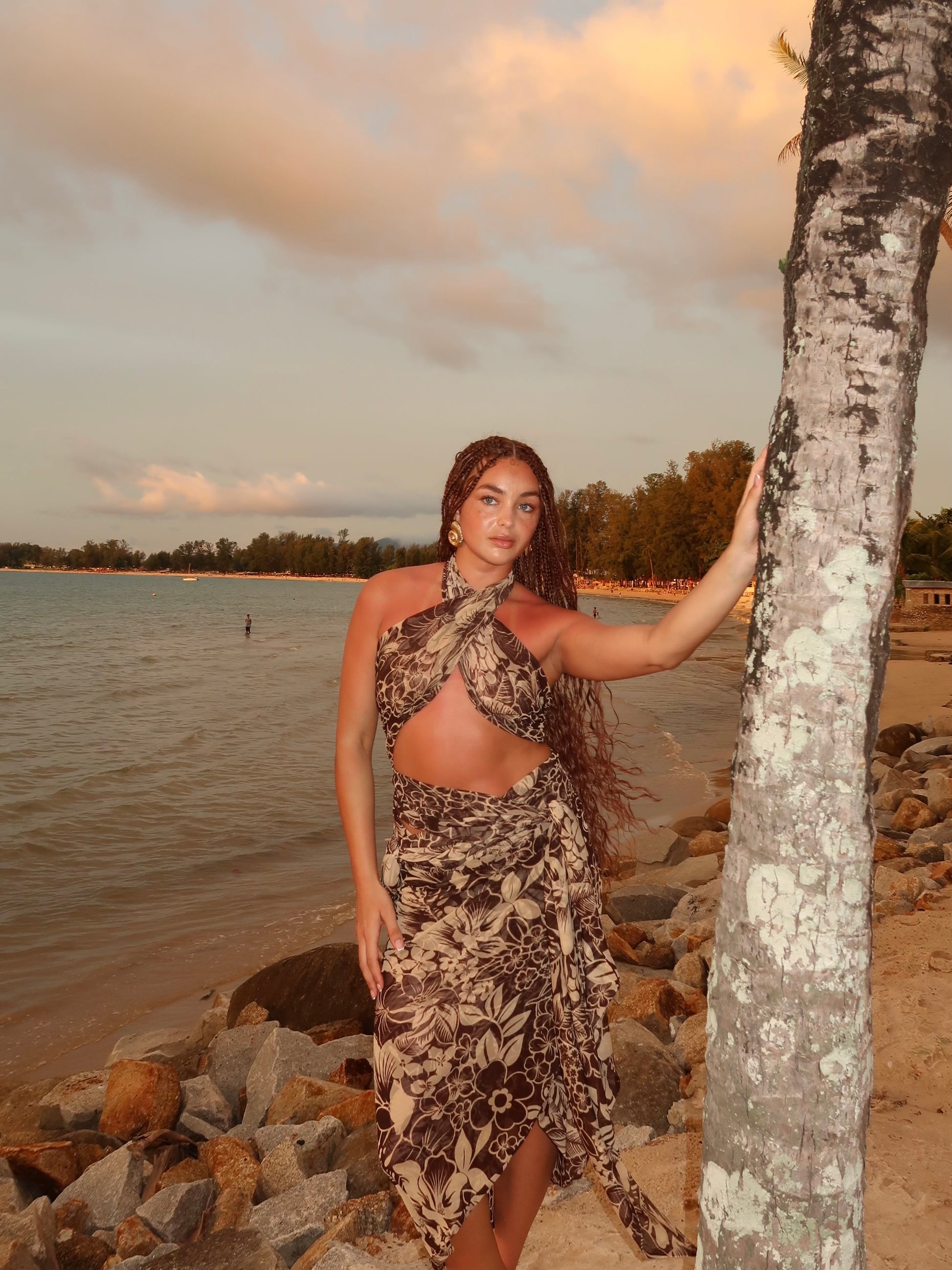 The Twist Two Piece is BACK and it's better! Super limited edition (less than 10) our DEADSTOCK Manila fabric is a super stretchy power mesh in a gorgeous brown and cream Hawaii inspired print. Made to be worn together or separately, over swimwear or for sunset drinks!